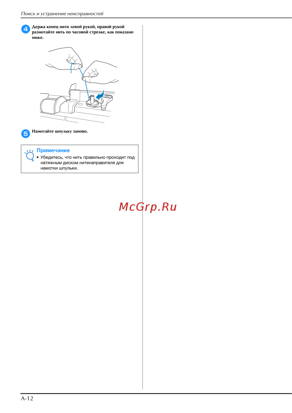 - В случае неправильной заправки верхней нити верхнюю нить продетую сквозь материал невозможно протянуть наверх из за чего верхняя нить запутывается в шпульном колпачке что создает стучащий звук p.188