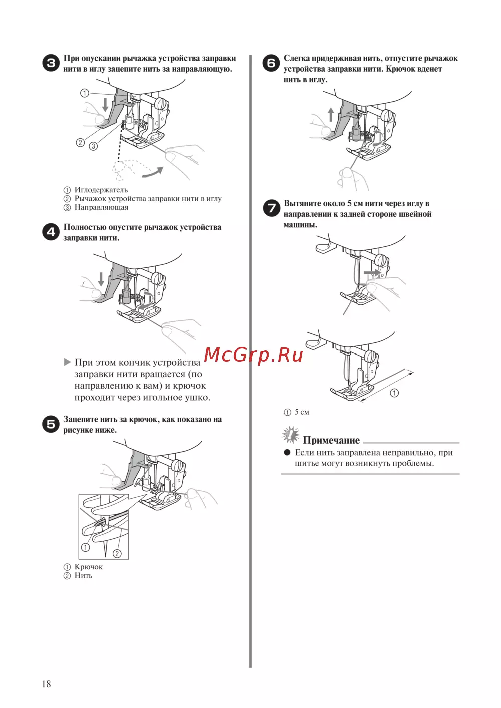 - Расположите материал таким образом чтобы передний край разметки петли был совмещен с красными метками по бокам лапки затем опустите рычаг лапки проведите верхнюю нить вниз через отверстие в прижимной лапке p.43