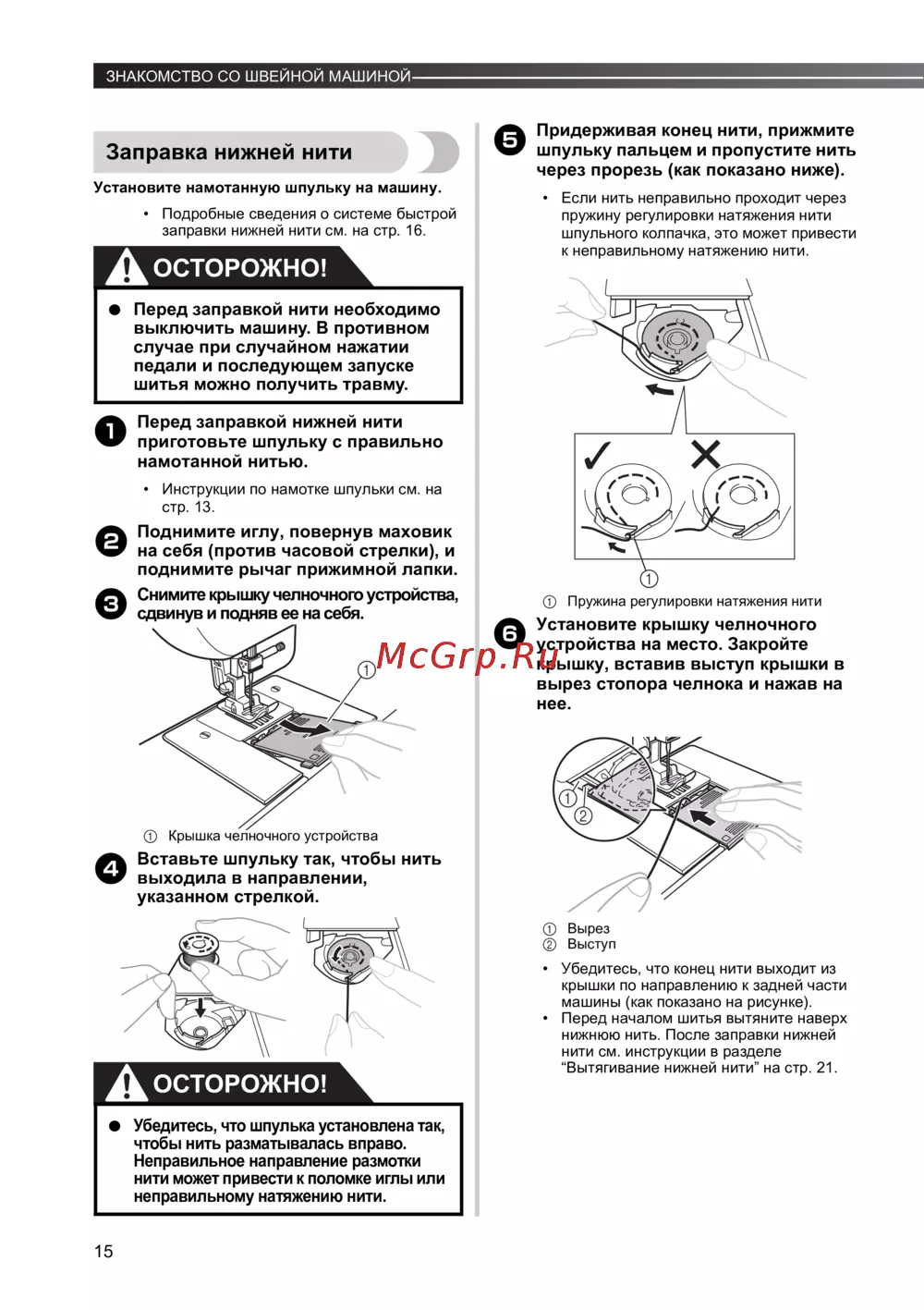 - Убедитесь что шпульный колпачок вставлен правильно так как в противном случае игла может сломаться p.42