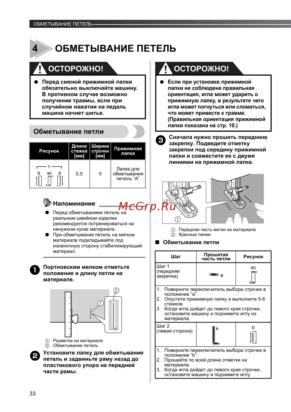 - А автоматическое 4 этапное обметывание петел p.46