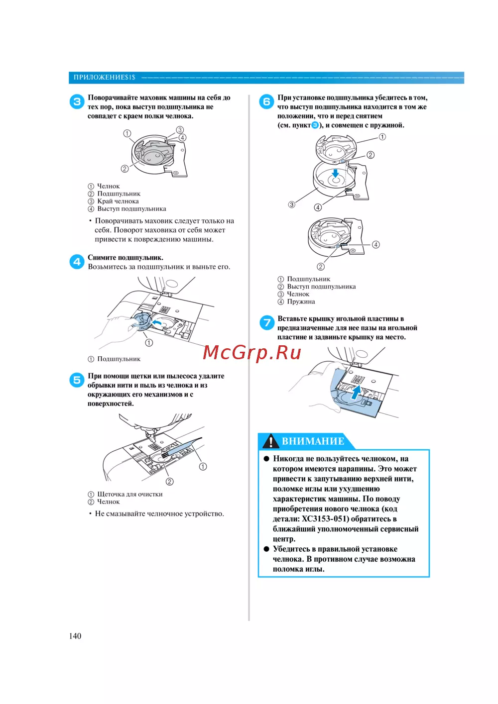 - Никогда не пользуйтесь челноком на котором имеются царапины это может привести к запутыванию верхней нити поломке иглы или ухудшению характеристик машины по поводу приобретения нового челнока код детали xc3153 051 обратитесь в ближайший уполномоченный сервисный центр p.146