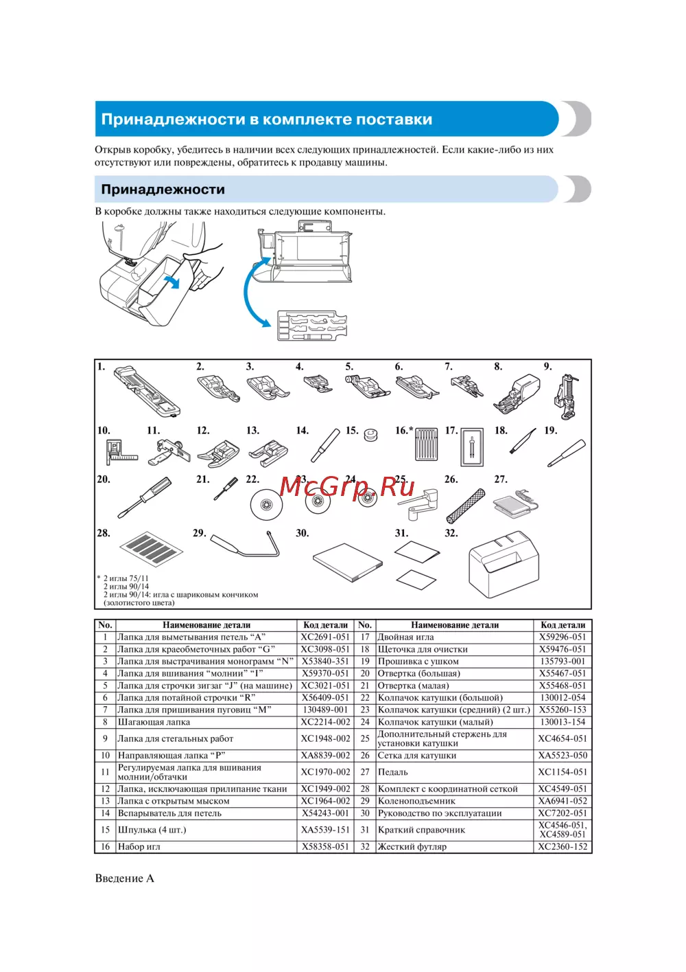 - На иллюстрации ниже представлены дополнительные принадлежности к этой швейной машине p.7