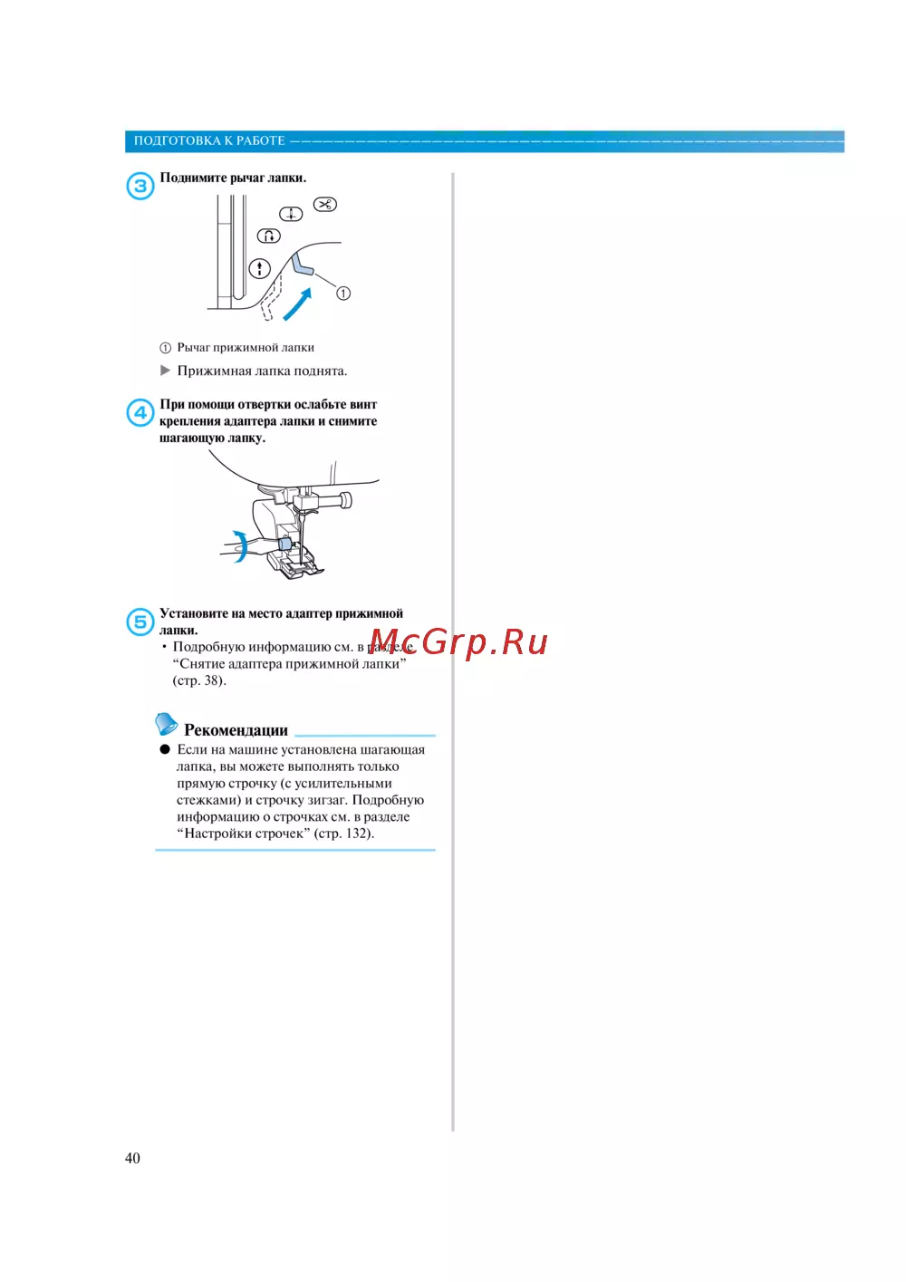 - После изменения ширины строчки медленно поверните маховик машины на себя и убедитесь в том что игла не касается прижимной лапки если игла ударит по лапке она может погнуться или сломаться p.119