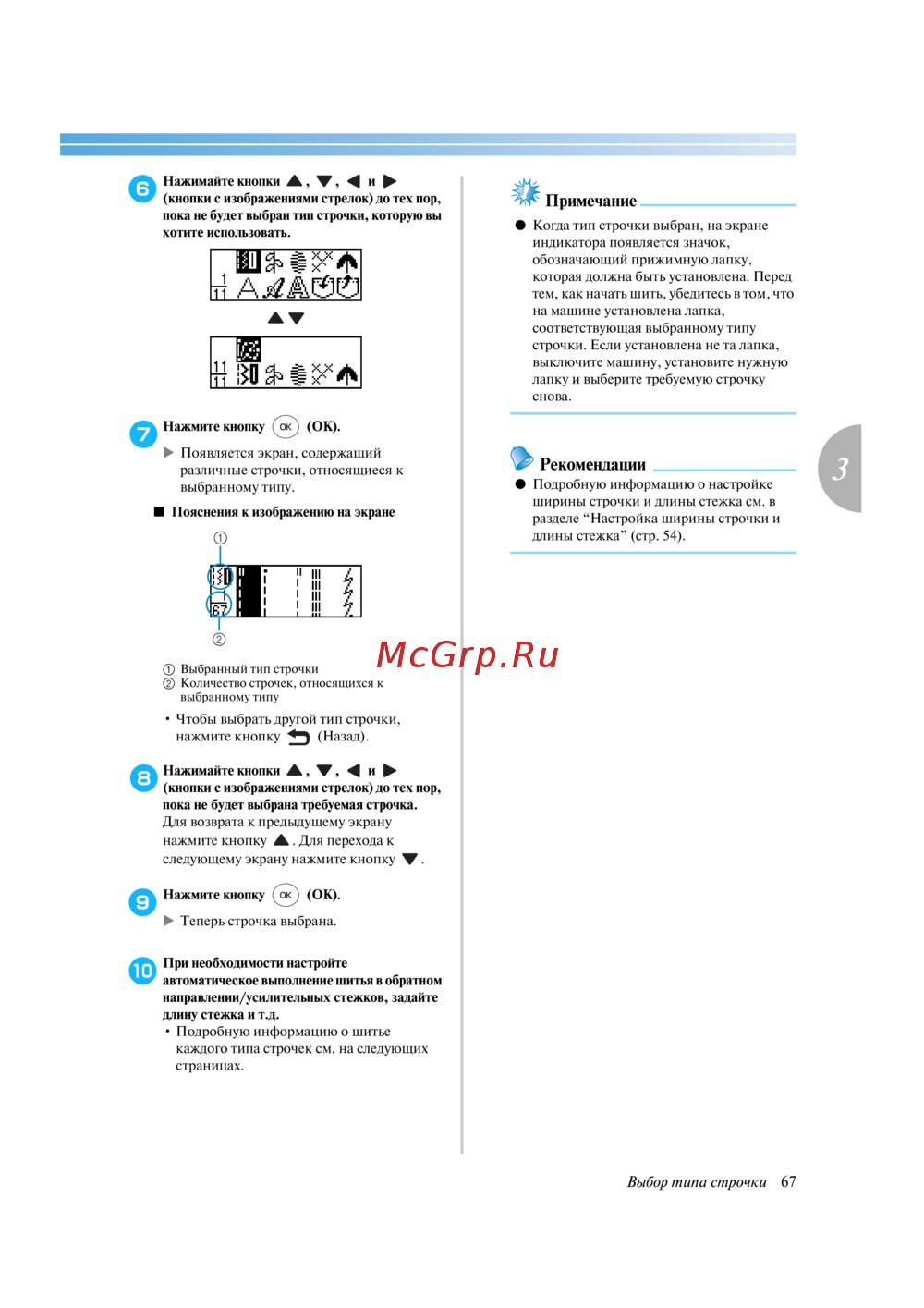 - Установите ширину строчки не более 6 0 мм в противном случае игла может погнуться или сломаться p.119