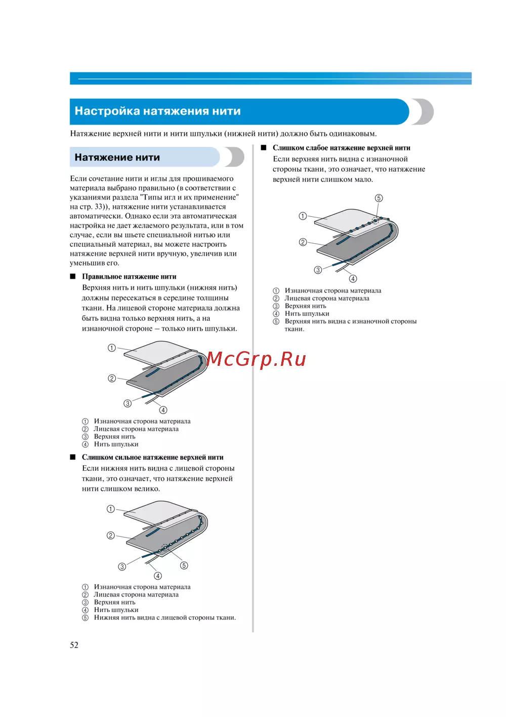 Натяжение верхней нити и нити шпульки (нижней нити) должно быть одинаковым.