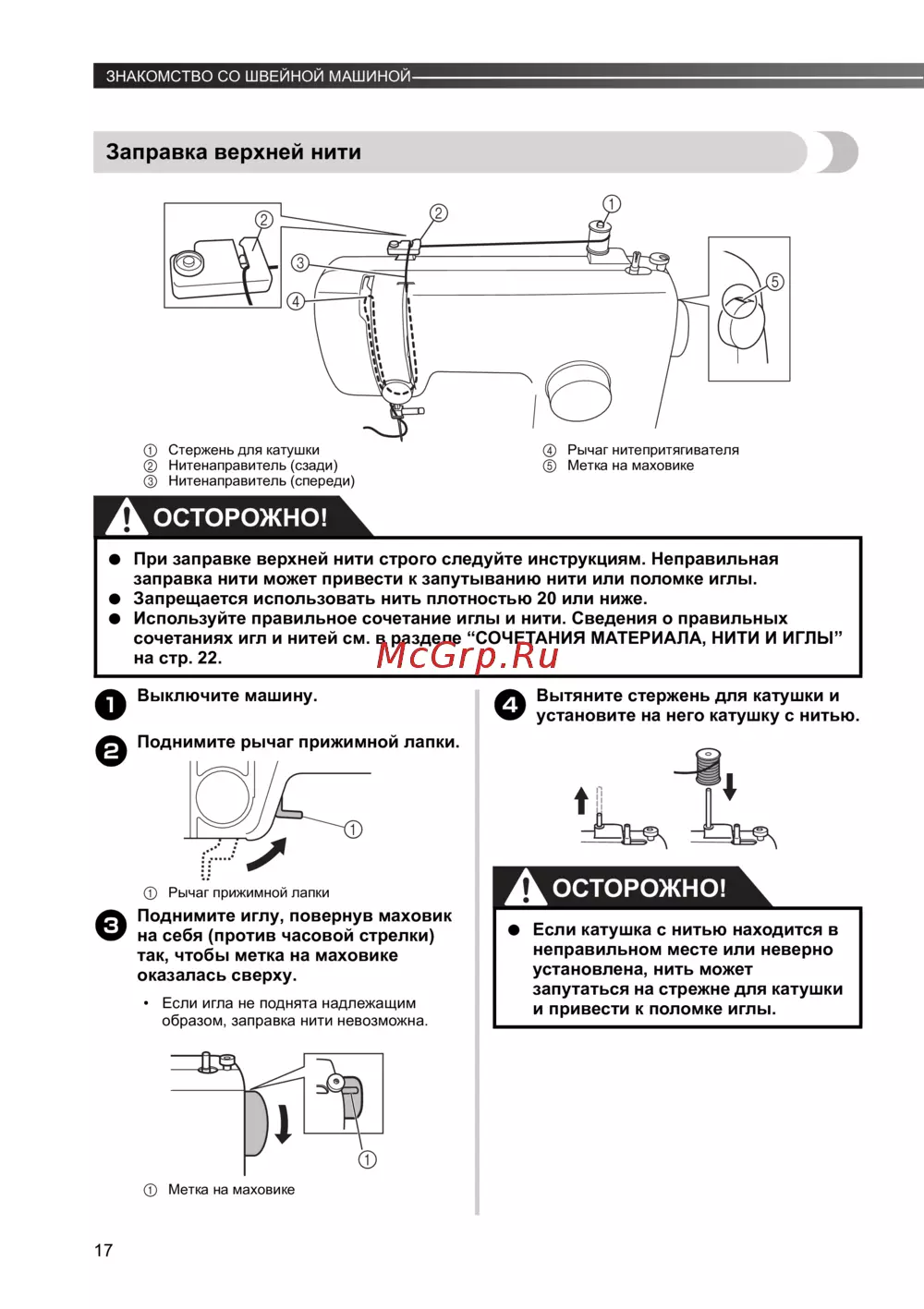 ● При заправке верхней нити строго следуйте инструкциям. Неправильная