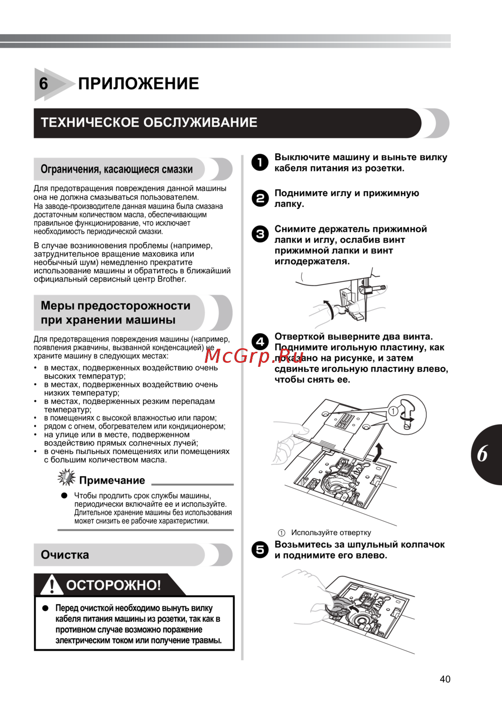 - Запрещается использовать машину если у нее поврежден кабель питания или вилка если машина плохо работает если ее уронили если она была повреждена или если на нее попала вода верните машину ближайшему официальному дилеру brother или в официальный сервисный центр для проверки ремонта и наладки ее электрической или механической части p.2