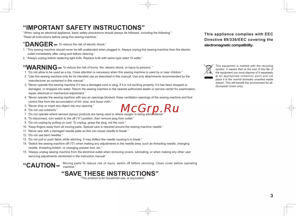 15. “Always unplug sewing machine from the electrical outlet when removing covers, lubricating, or when making any other user