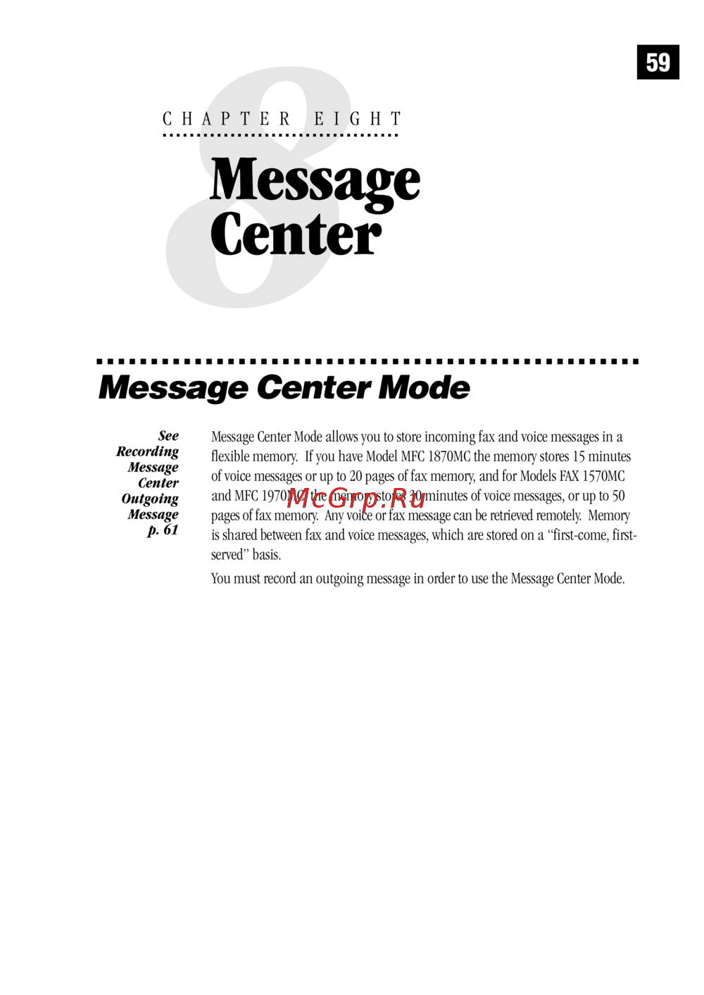 Message Center Mode allows you to store incoming fax and voice messages in a