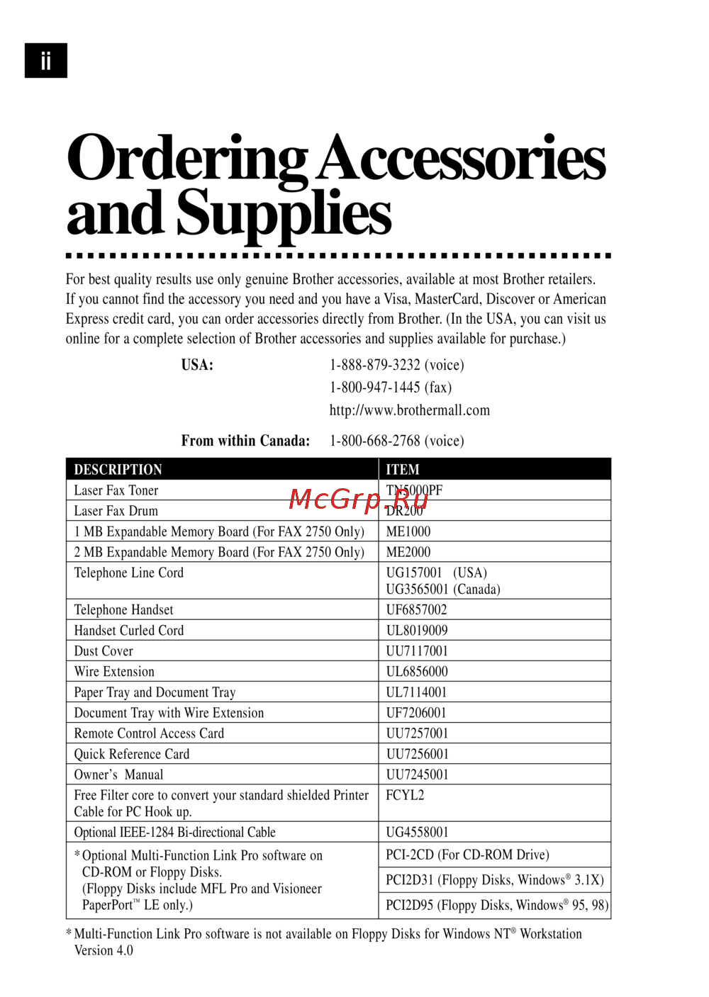 - If an item is missing call brother customer service at 1 800 284 4329 usa 1 800 853 6660 from within canada or 1 514 685 6464 from within montreal see ordering accessories and supplies on page ii for the correct item numbers p.20