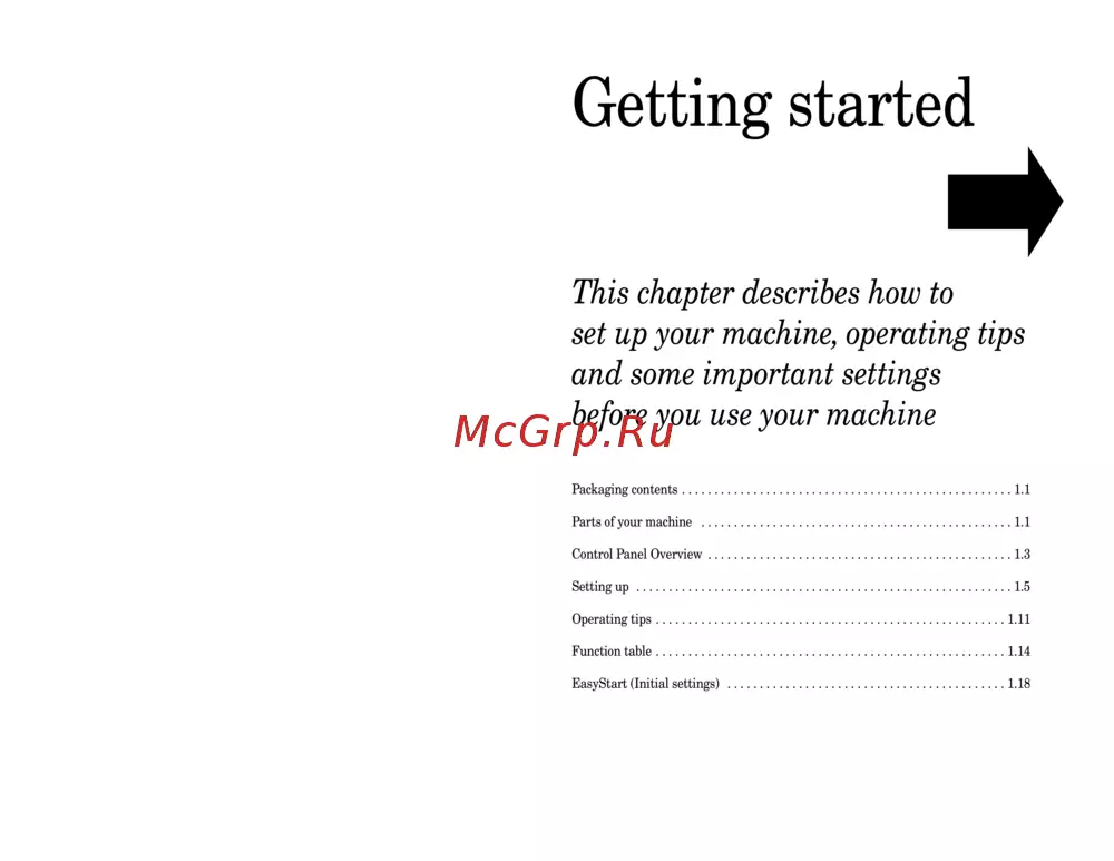 - Getting started page 1 describes how to set up your machine operating tips and some important settings that you should perform before you use your machine p.8