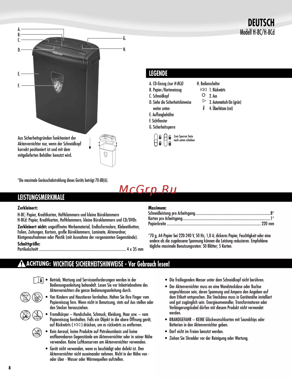 Fellowes Powershred H 8C [8/40] Wichtige sicherheitshinweise vor gebrauch lesen