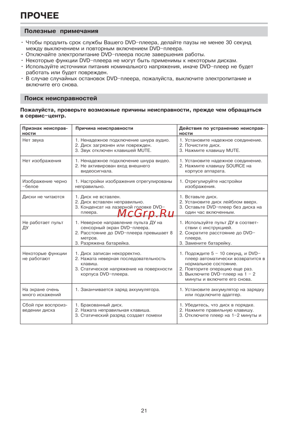 - Òîáû ïðîäëèòü ñðîê ñëóæáû âàøåãî dvd ïëååðà äåëàéòå ïàóçû íå ìåíåå 30 ñåêóíä ìåæäó âûêëþ åíèåì è ïîâòîðíûì âêëþ åíèåì dvd ïëååðà îòêëþ àéòå ýëåêòðîïèòàíèå dvd ïëååðà ïîñëå çàâåðøåíèÿ ðàáîòû íåêîòîðûå ôóíêöèè dvd ïëååðà íå ìîãóò áûòü ïðèìåíèìû ê íåêîòîðûì äèñêàì èñïîëüçóéòå èñòî íèêè ïèòàíèÿ íîìèíàëüíîãî íàïðÿæåíèÿ èíà å dvd ïëååð íå áóäåò ðàáîòàòü èëè áóäåò ïîâðåæäåí â ñëó àå ñëó àéíûõ îñòàíîâîê dvd ïëååðà ïîæàëóéñòà âûêëþ èòå ýëåêòðîïèòàíèå è âêëþ èòå åãî ñíîâà p.23