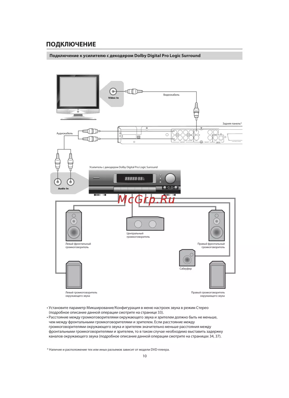 - Установите параметр микширование конфигурация в меню настроек звука в режим стерео подробное описание данной операции смотрите на странице 33 расстояние между громкоговорителями окружающего звука и зрителем должно быть не меньше чем между фронтальными громкоговорителями и зрителем если расстояние между громкоговорителями окружающего звука и зрителем значительно меньше расстояния между фронтальными громкоговорителями и зрителем то в таком случае необходимо выставить задержку каналов окружающего звука подробное описание данной операции смотрите на страницах 34 37 p.12