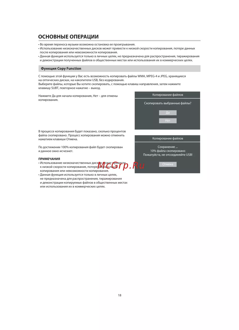 С помощью этой функции у Вас есть возможность копировать файлы WMA, MPEG-4 и JPEG, хранящиеся