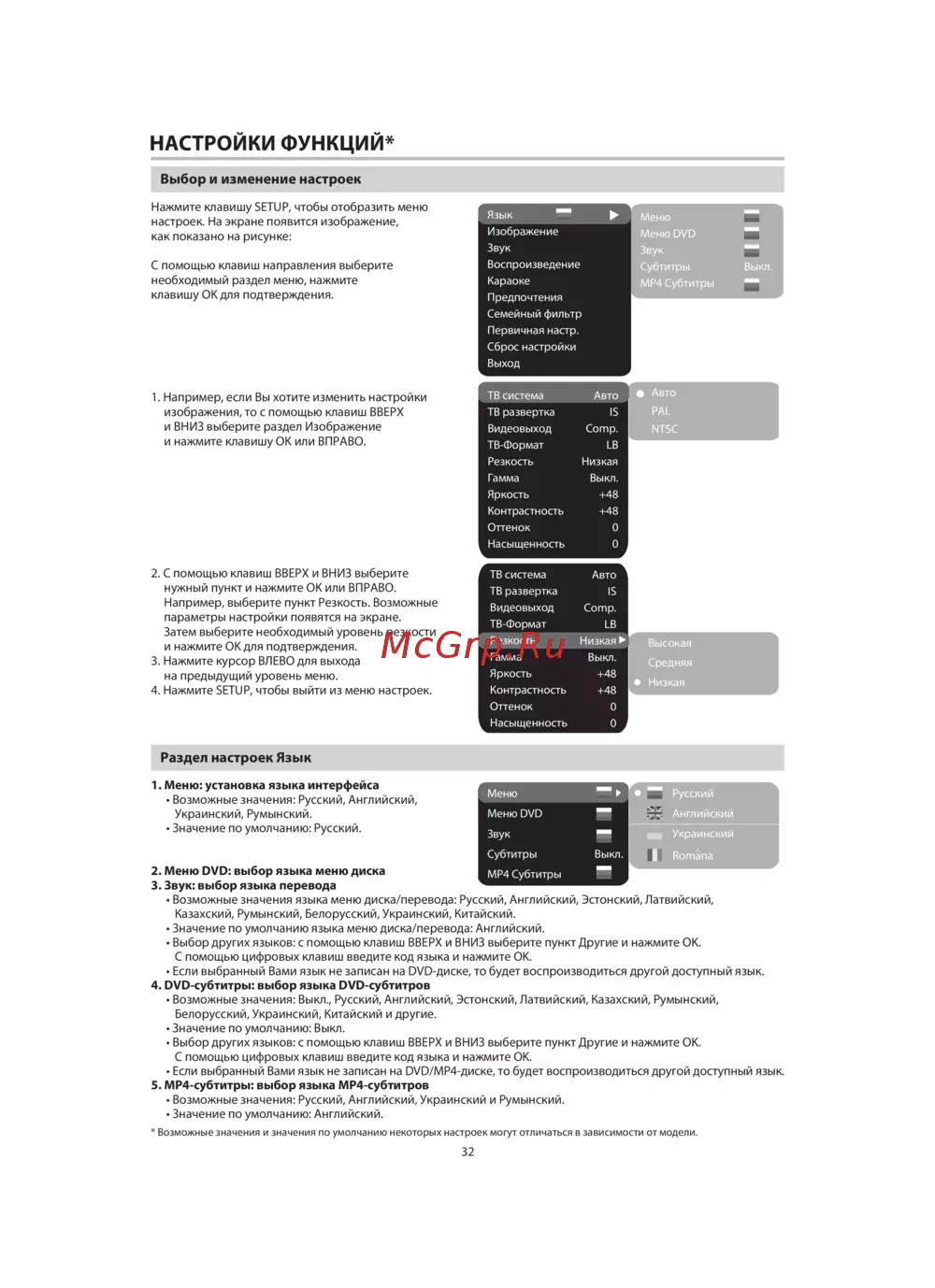 • Если выбранный Вами язык не записан на DVD/MP4-диске, то будет воспроизводиться другой доступный язык.