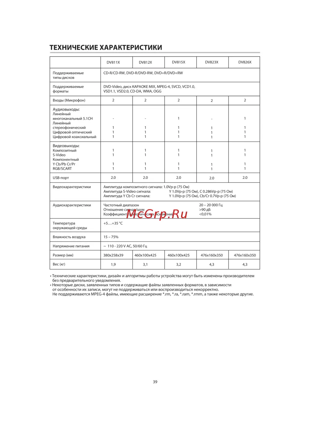 - Технические характеристики дизайн и алгоритмы работы устройства могут быть изменены производителем без предварительного уведомления некоторые диски заявленных типов и содержащие файлы заявленных форматов в зависимости от особенности их записи могут не поддерживаться или воспроизводиться некорректно не поддерживаются mpeg 4 файлы имеющие расширение rm ra ram rmm а также некоторые другие p.41