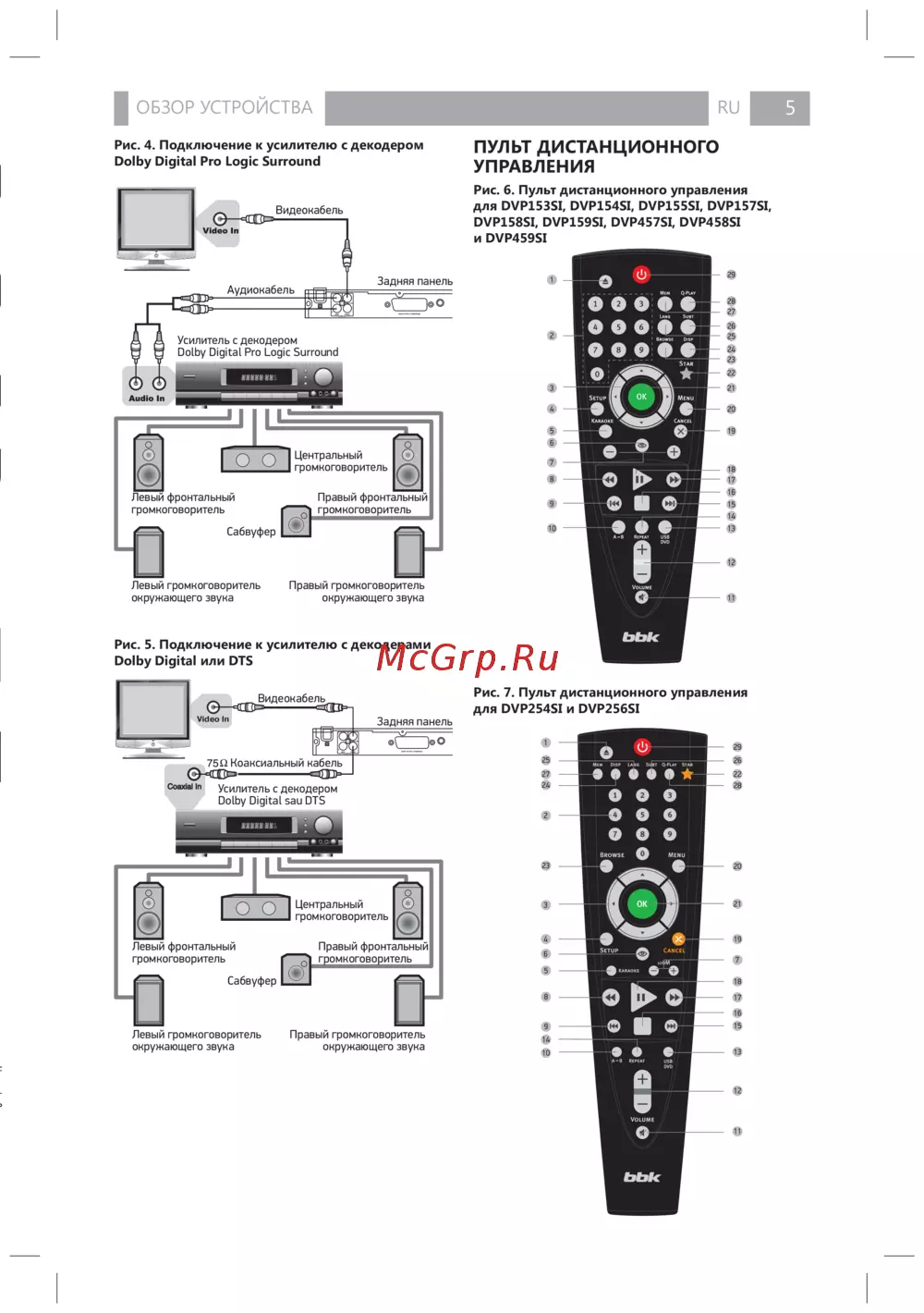- Рис 5 подключение к усилителю с декодерами dolby digital или dts p.7