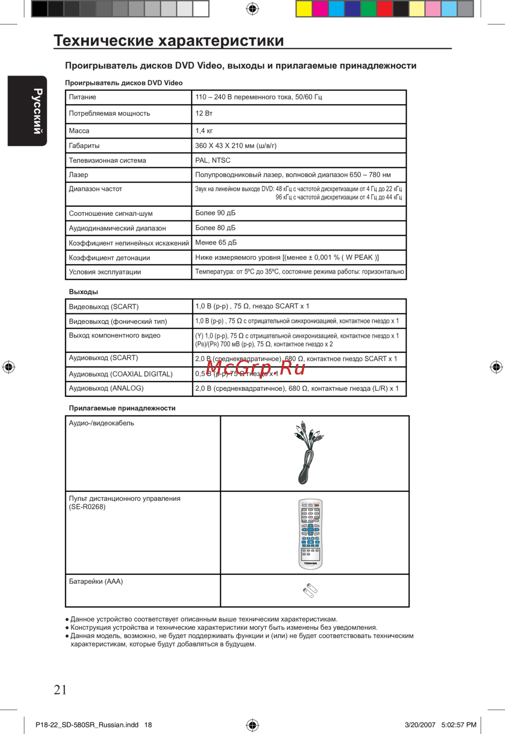 Toshiba SD-580SR_SD-581SR [22/23] Технические характеристики