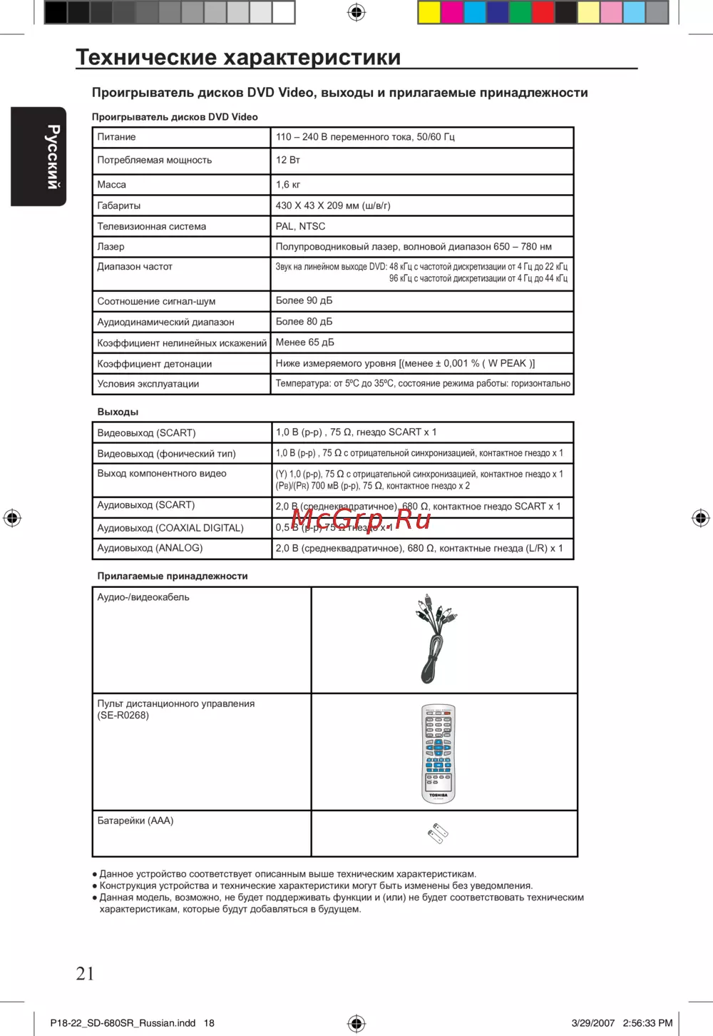Toshiba SD-680SR_SD-682KR [22/23] Технические характеристики