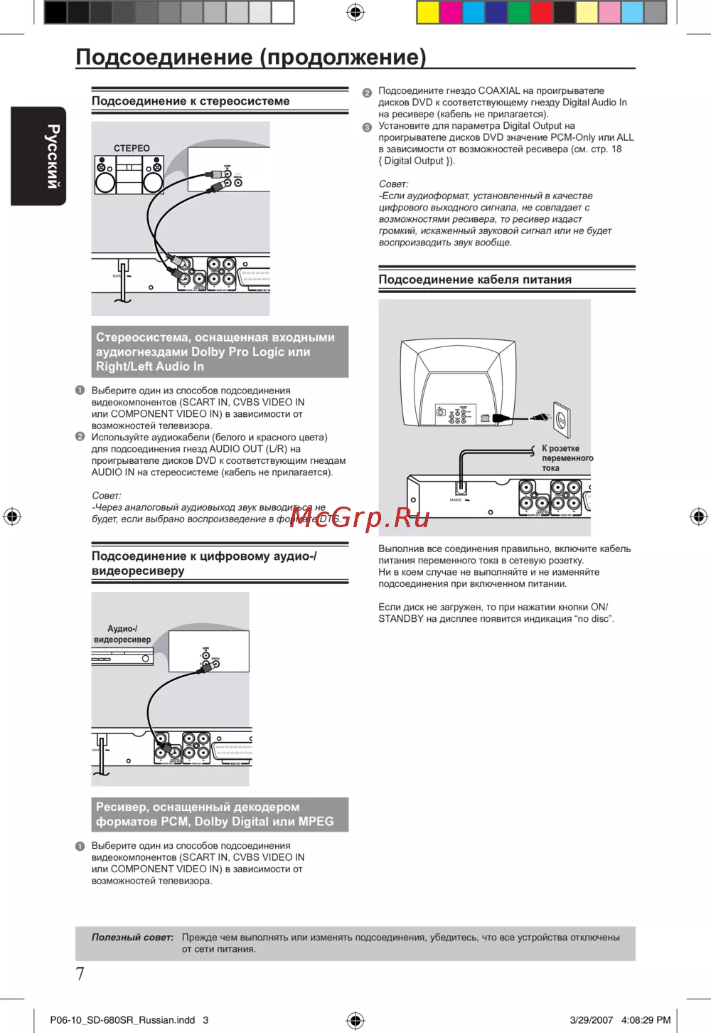 - Подсоединение к цифровому аудио видеоресиверу p.8