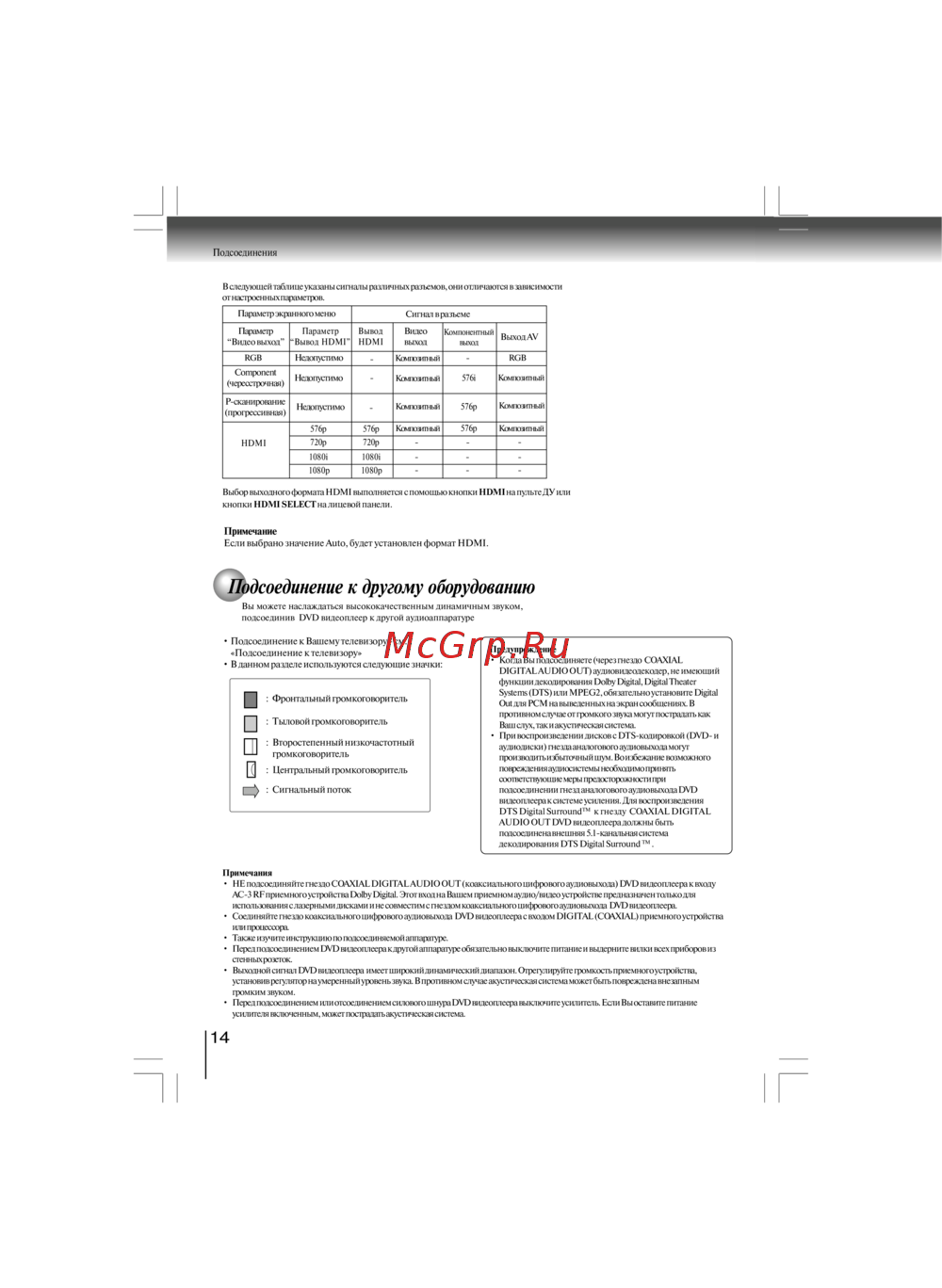 • ÍÅ ïîäñîåäèíÿéòå ãíåçäî COAXIAL DIGITAL AUDIO OUT (êîàêñèàëüíîãî öèôðîâîãî àóäèîâûõîäà) DVD âèäåîïëååðà ê âõîäó