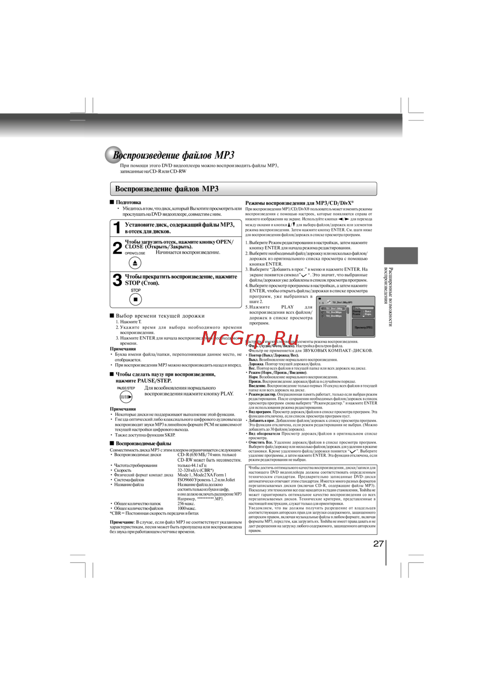 - Ïðè ïîìîùè ýòîãî dvd âèäåîïëååðà ìîæíî âîñïðîèçâîäèòü ôàéëû mp3 çàïèñàííûå íà cd r èëè cd rw p.27