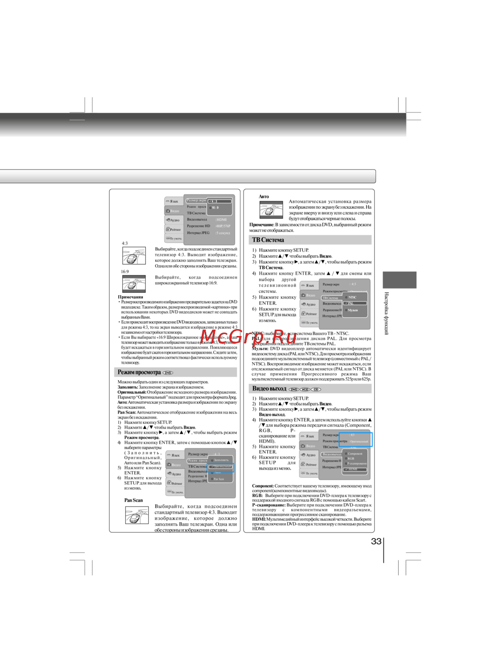 - Äëÿ âûáîðà ðåæèìà ïåðåäà è ñèãíàëà component rgb p ñêàíèðîâàíèå èëè hdmi 5 íàæìèòå êíîïêó enter 6 íàæìèòå êíîïêó setup äëÿ âûõîäà èç ìåíþ p.33