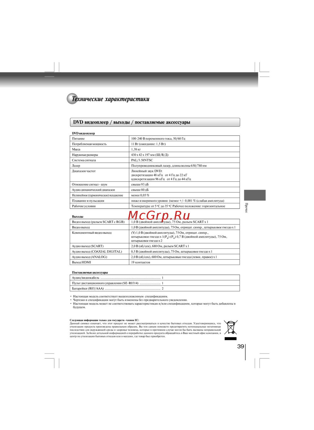 Toshiba SD-890KR [39/40] Òåõíè åñêèå õàðàêòåðèñòèêè