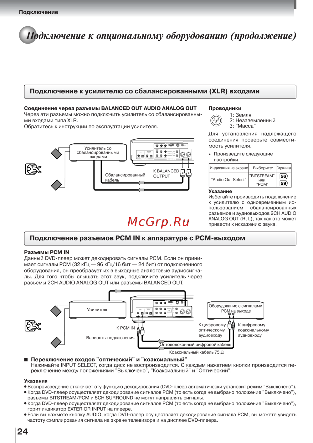 мает сигналы PCM (32 кГц — 96 кГц/16 бит — 24 бит) от подключенного