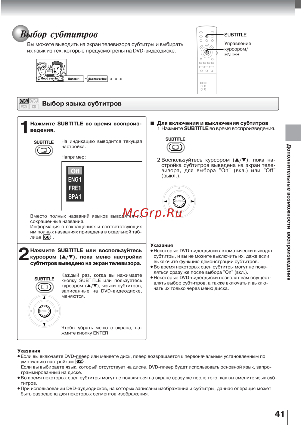Если вы выбираете язык, который отсутствует на диске, DVD-плеер будет использовать основной язык, запро-