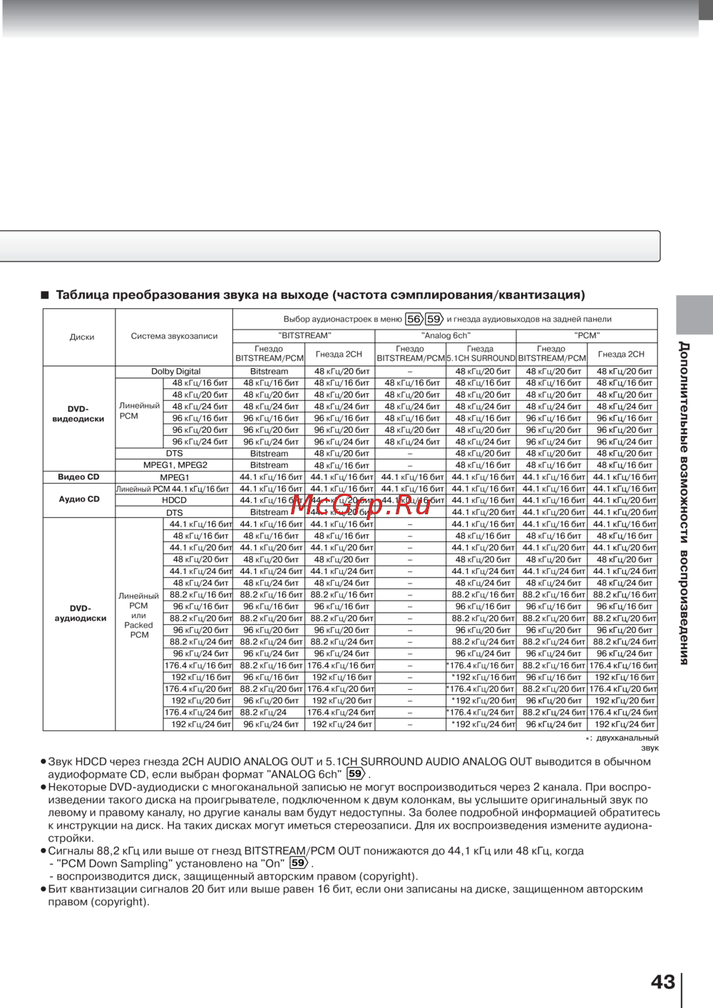 Toshiba SD-9500 [43/72] Таблица преобразования звука на выходе частота сэмплирования квантизация