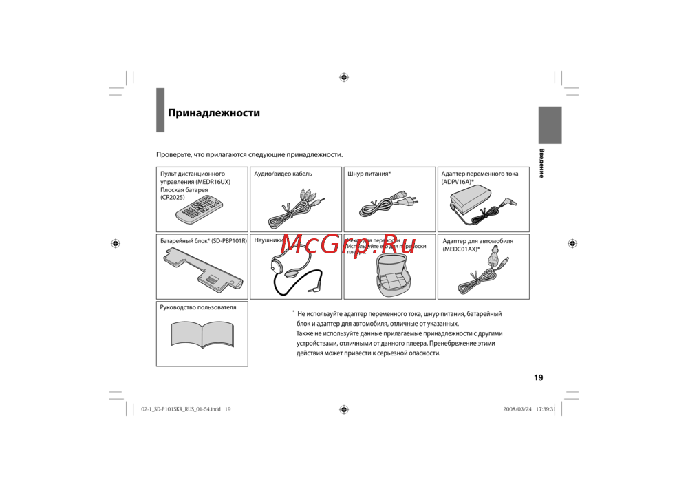 - Не используйте адаптер переменного тока шнур питания батарейный блок и адаптер для автомобиля отличные от указанных также не используйте данные прилагаемые принадлежности с другими устройствами отличными от данного плеера пренебрежение этими действия может привести к серьезной опасности p.19