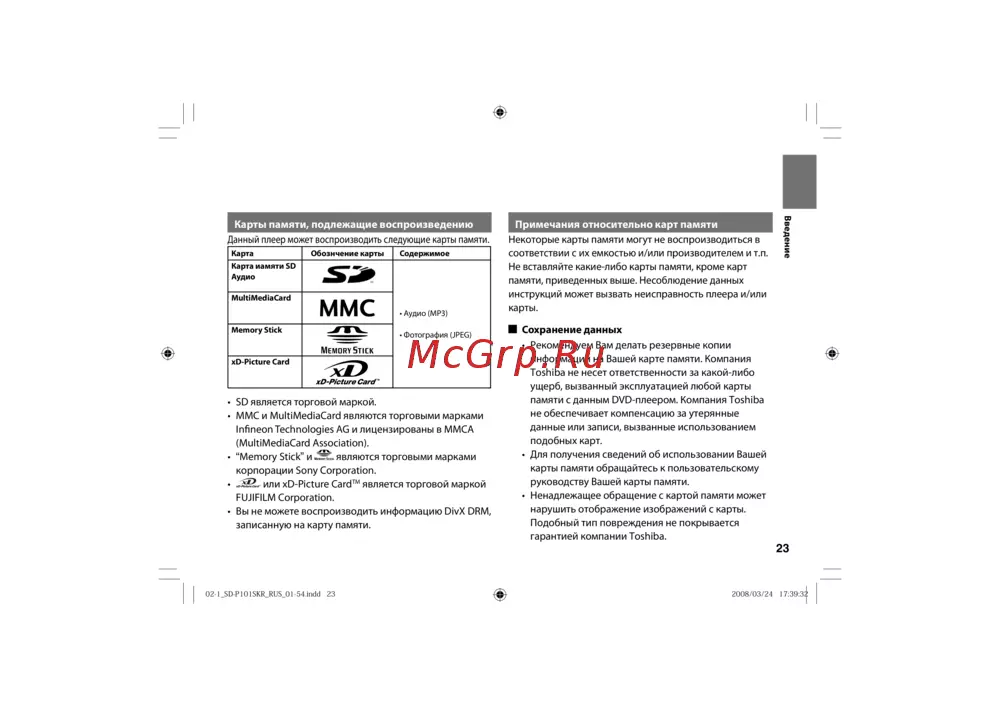 Toshiba SD-P101SKR [23/80] Карты памяти подлежащие воспроизведению
