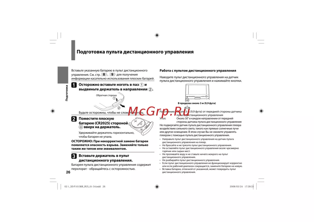 • Вставка батареи, отличной от указанной, может повредить пульт