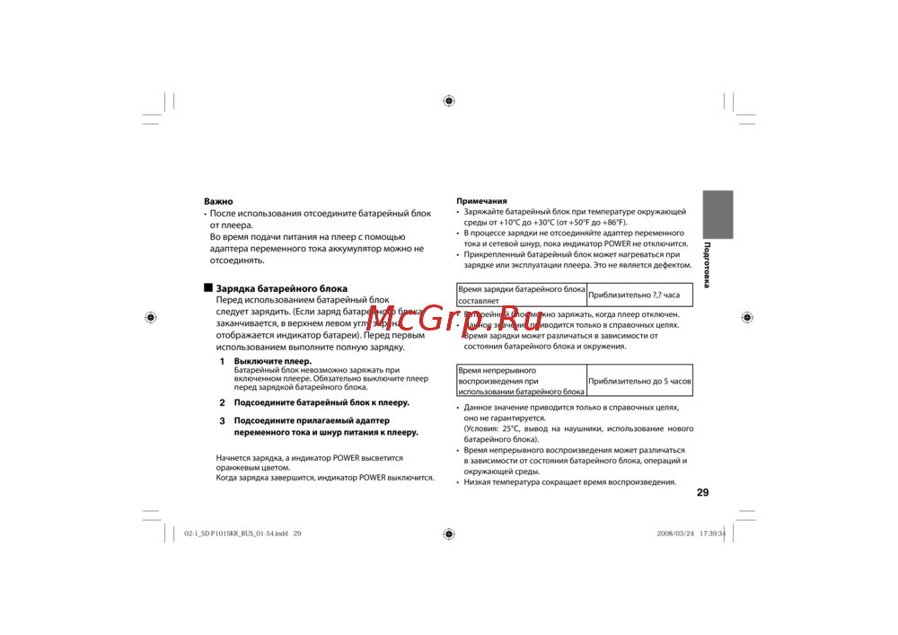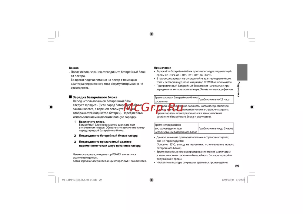 • Батарейный блок можно заряжать, когда плеер отключен.