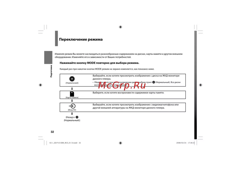 - Изменяя режим вы можете наслаждаться разнообразным содержанием на дисках карты мамяти и другом внешнем оборудовании изменяйте его в зависимости от ваших потребностей p.32