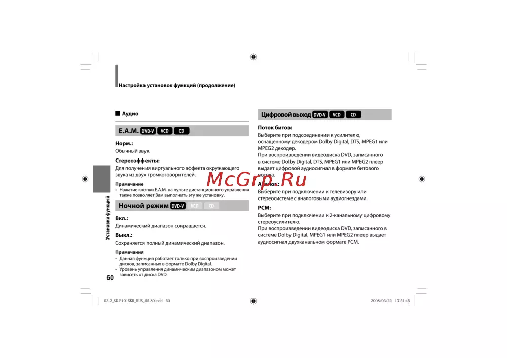 - Входные сигналы частотой 88 2 кгц или выше с гнезда bitstream pcm конвертируются с понижением частоты до 44 1 кгц или 48 кгц когда выбрана опция вкл стереоэффектов воспроизводится диск с защитой авторских прав на диске с защитой авторских прав квантизация будет ограничена до 16 бит p.74
