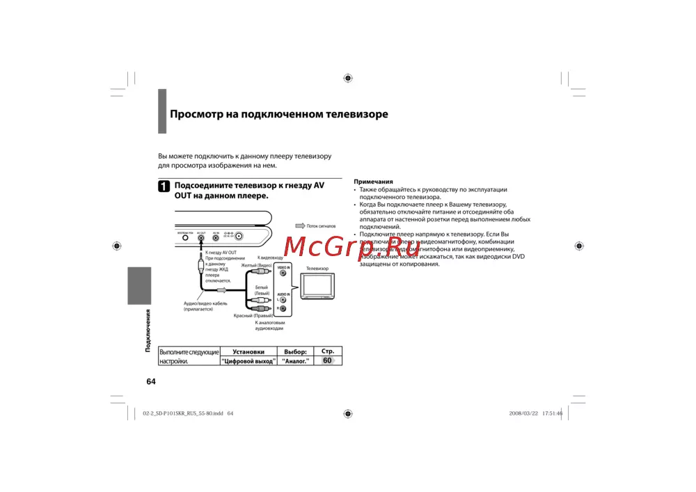 - Подсоедините телевизор к гнезду av out на данном плеере p.64