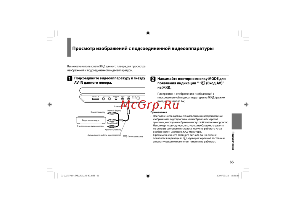 - Подсоедините видеоаппаратуру к гнезду av in данного плеера p.65