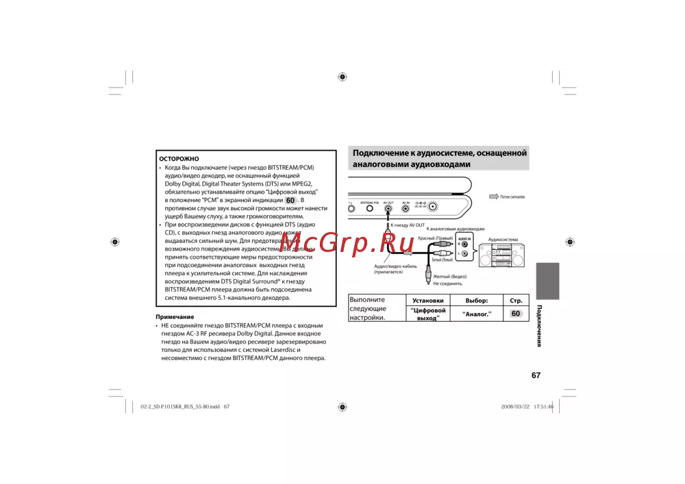 - Способ подключения зависит от типов входного аудиосигнала цифрового или аналогового p.66