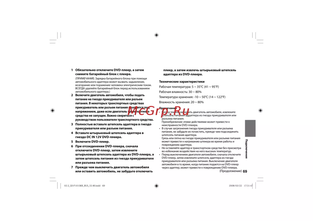 - Полностью вставьте штепсель адаптера в гнездо прикуривателя или разъем питания 4 вставьте штырьковый штепсель адаптера в гнездо dc in 12v dvd плеера 5 включите dvd плеер 6 при отсоединении dvd плеера сначала отключите dvd плеер затем извлеките штырьковый штепсель адаптера из dvd плеера а затем штепсель питания из гнезда прикуривателя или разъема питания 7 прежде чем выключить двигатель автомобиля или оставить автомобиль не забудьте отключить p.69