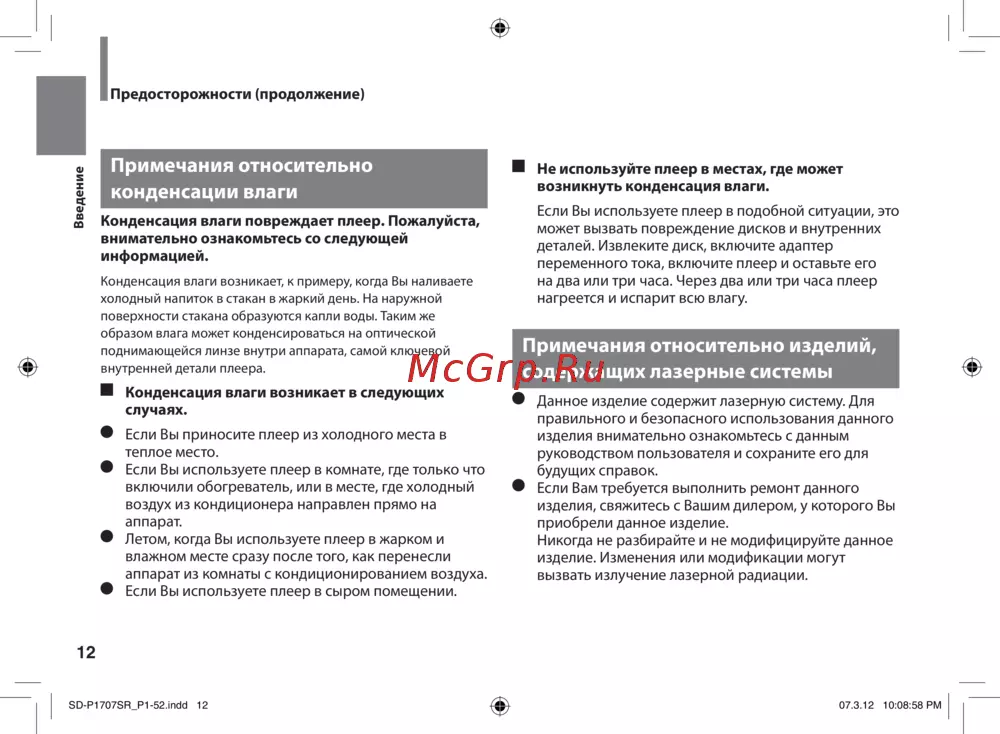 Конденсация влаги повреждает плеер. Пожалуйста,