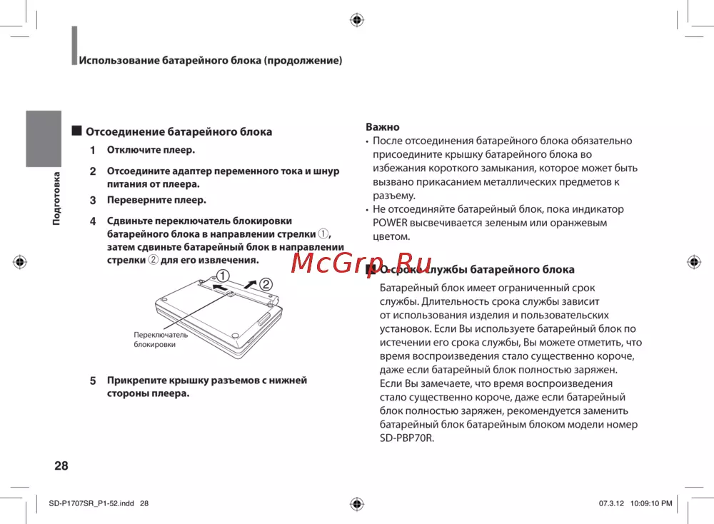 Toshiba SD-P1707SR [28/76] Отсоединение батарейного блока