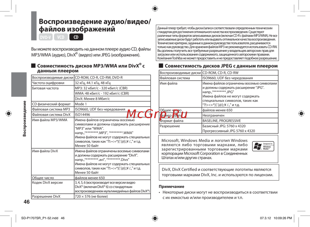 Toshiba SD-P1707SR [46/76] Совместимость дисков mp3 wma или div