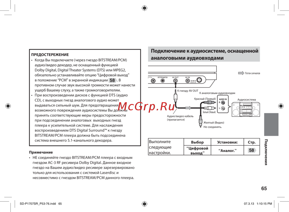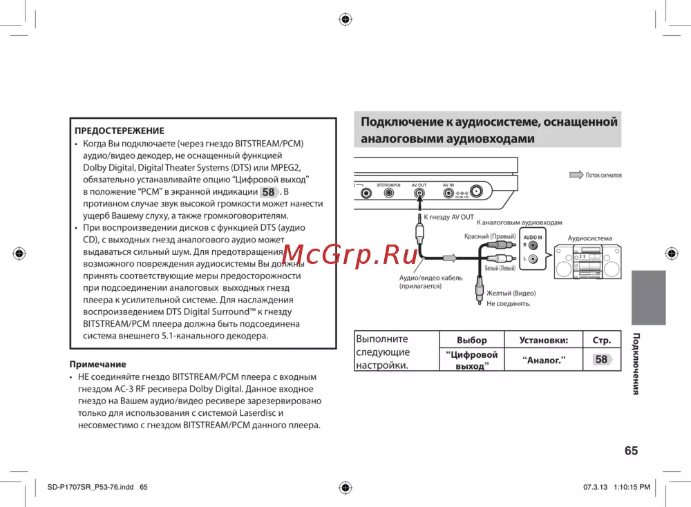 - Способ подключения зависит от типов входного аудиосигнала цифрового или аналогового p.64