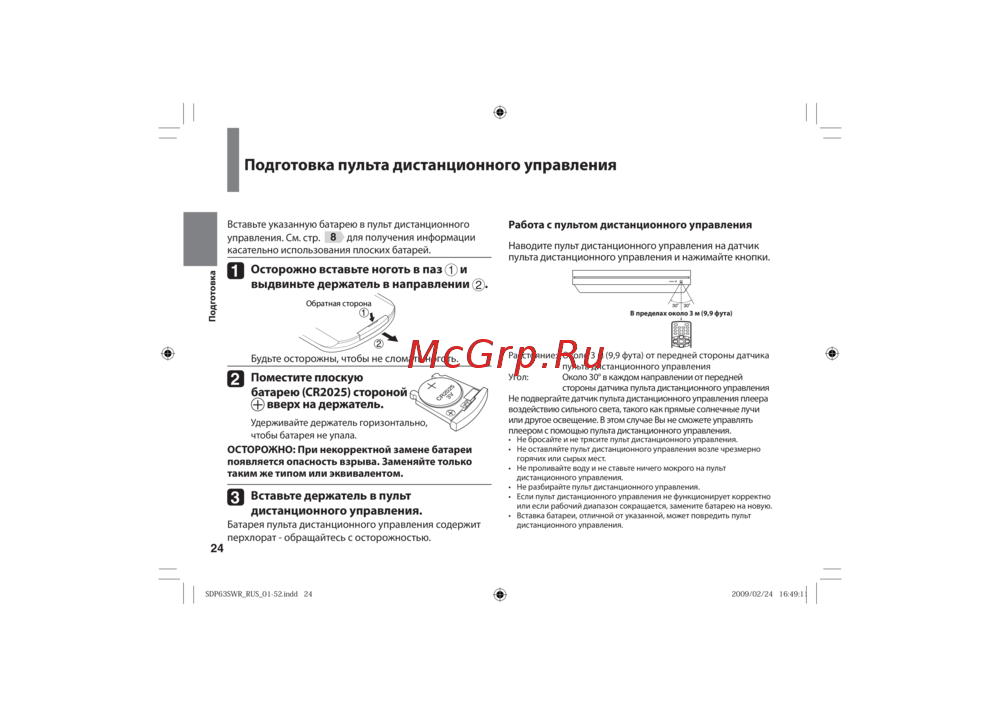 • Вставка батареи, отличной от указанной, может повредить пульт