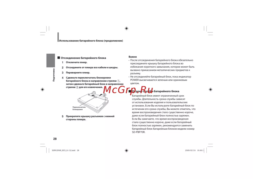 Toshiba SDP63SWR [28/76] О сроке службы батарейного блока