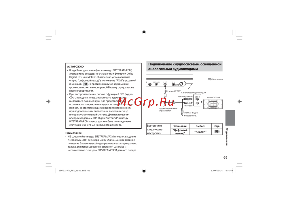- Способ подключения зависит от типов входного аудиосигнала цифрового или аналогового p.64
