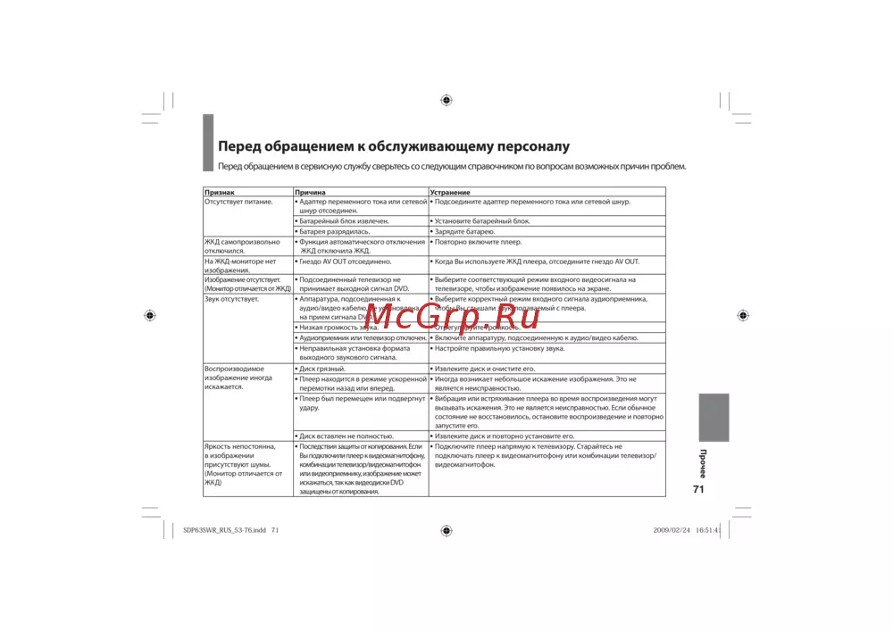 - Перед обращением в сервисную службу сверьтесь со следующим справочником по вопросам возможных причин проблем p.71